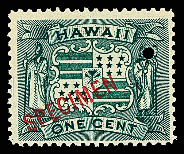 5654 Snh 80 image1899, Coat of Arms, 1¢ dark green, "SPECIMEN" overprint in red (Scott 80), position LR3, o.g., never hinged, fresh and sound with proof-like color and detail, clean overprint and security punch at right (figure's head), Fine to Very Fine. (Image) Suggested Bid $96
