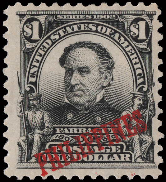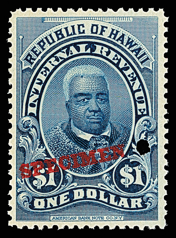 5655 Snh R11 imageRevenue, 1897, $1 dark blue, "SPECIMEN" overprint in red (Scott R11), position T28, o.g., never hinged, Post Office fresh with bold color, security punch at right, Very Fine. (Image) Suggested Bid $96