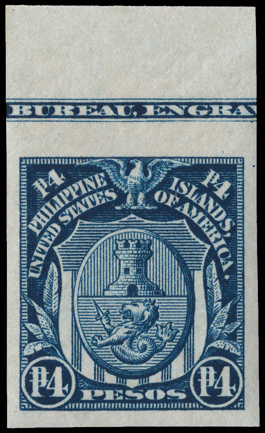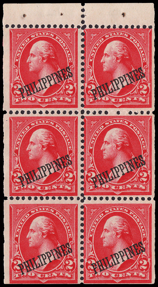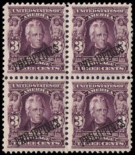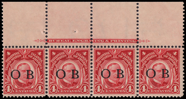 5673 nh 242 var. image1906, 4c carmine with black Bandholtz "OB" overprint (Scott 242 var.), top sheet margin horizontal strip of 4 with full imprint, o.g., never hinged, exceptionally bright and fresh, Very Fine. (Image) Suggested Bid $50