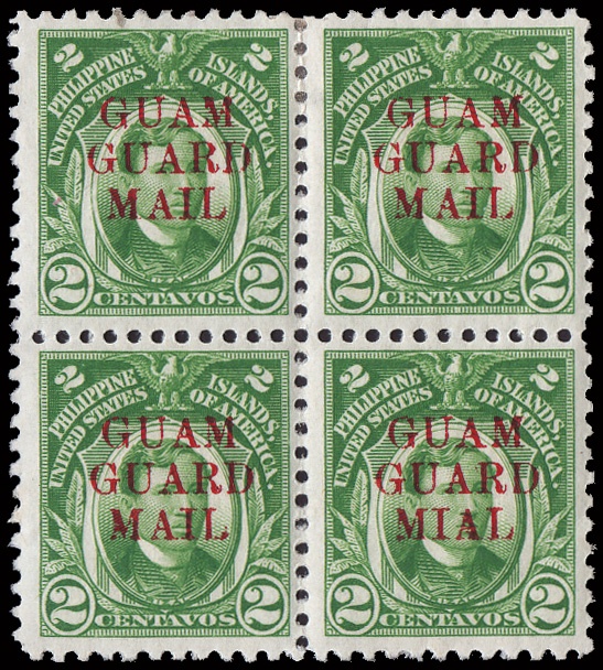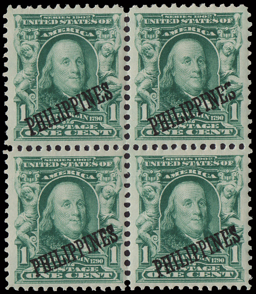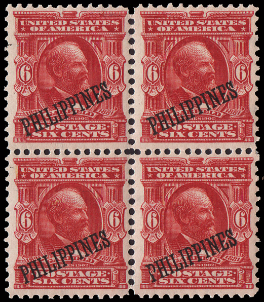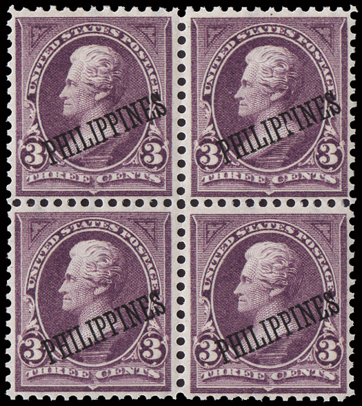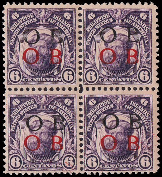 5675 nh/ogbl 263 var. image1911, 6c deep violet with both double (black & red) Bandholtz "OB" overprint (Scott 263 var.), a choice mint block of 4, o.g., upper left lightly hinged, others never hinged, well centered and fresh, Very Fine. (Image) Suggested Bid $150