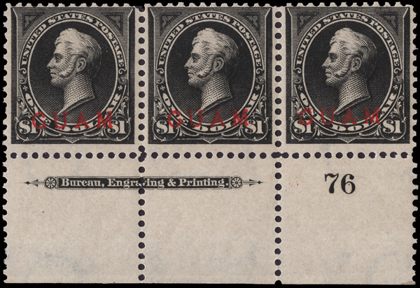 5645 og 12 image1899, $1 Perry, black, type I (Scott 12), a fresh, attractive bottom margin Plate No. 76 imprint strip of 3, tropicalized (dry) o.g., Fine.