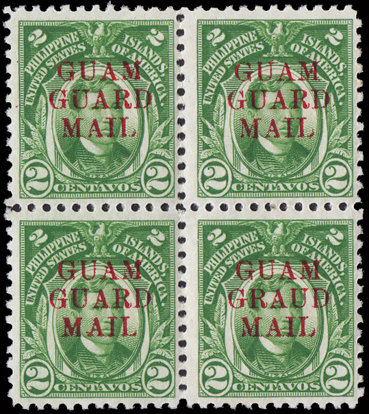 5647 nh/og M7a imageGuard Mail, 1930, 2¢ green, "GRAUD" (Scott M7a), the lower right stamp in a bright, fresh block of 4, o.g., the error being never hinged, Fine to Very Fine.