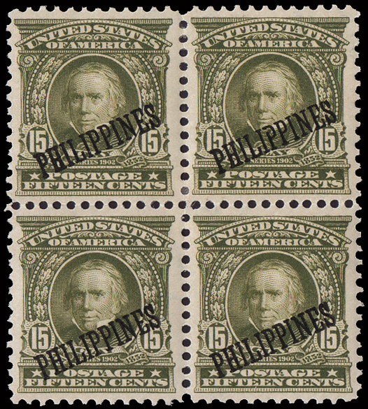 5671 og 235 image1904, 15¢ olive green (Scott 235), an truly extraordinary mint block of 4, o.g., wonderfully fresh and absolutely perfectly centered throughout; partial separation between left stamps, Extremely Fine to Superb. Each stamp a Gem!