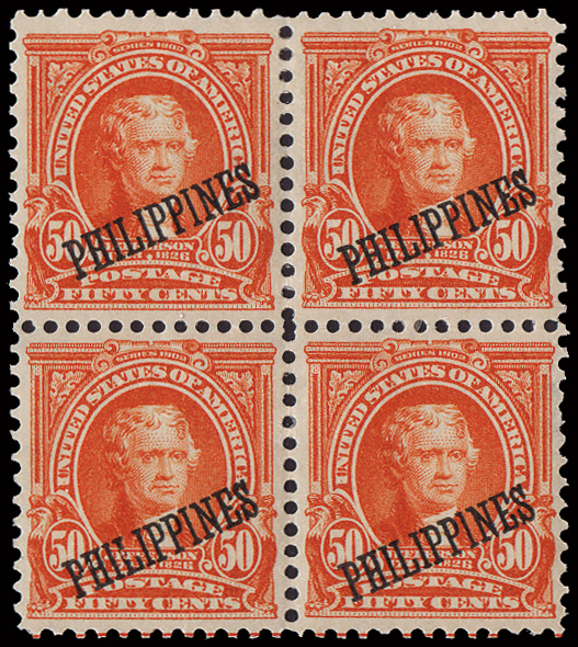5672 ogbl 236 image1903, 50¢ orange (Scott 236), an incredible mint block of 4, o.g., bright, fresh and perfectly centered with gorgeous color, Extremely Fine. A Gem of a block!