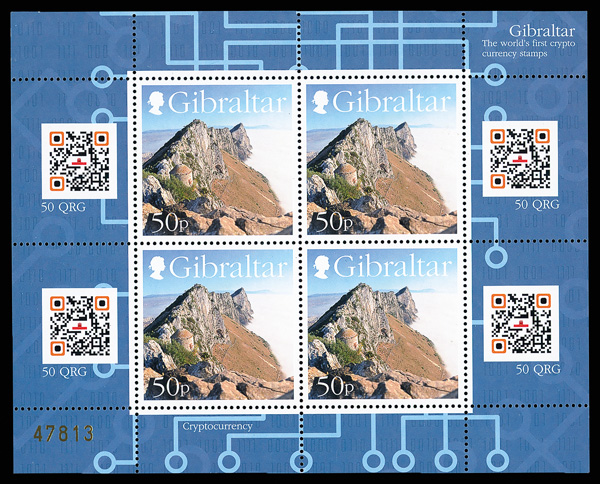 5811 nhbl 1532 footnote image2018, 50p Rock of Gibraltar, crypto-currency miniature sheet of four (Scott 1532 footnote), o.g., never hinged, Post Office fresh and sound, serial number 47813 (of 50,000 issued); unscanned, giving you the chance to earn 200QRG ("Corgi"?) crypto coins, Very Fine, the world's first crypto currency stamps. (Image) Suggested Bid $60