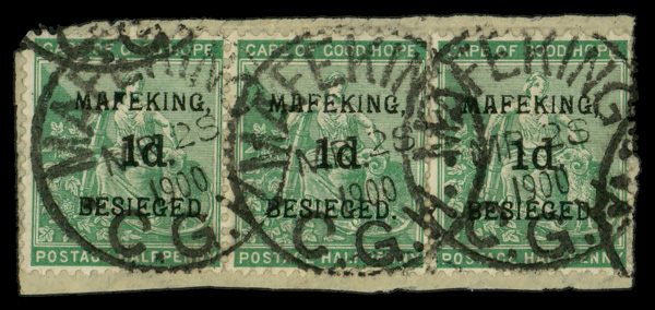 5802 Z 162 image1900, "Hope" and Symbols of Colony ½ p yellow green sucharged for Mafeking Besieged (Scott 162), strip of 3, Fine to Very Fine.