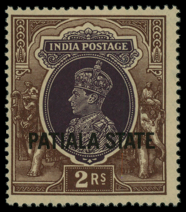 5817 nh 93 image1938, King Geiorge VI 2r dark brown & dark violet overprinted Patiala State (Scott 93), single, o.g., never hinged, Fine to Very Fine.
