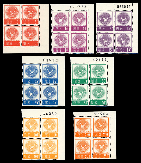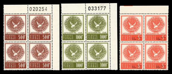 5805 nhbl R53 image1960, 5m-1000m & 10m on 5m Republic revenues, blocks of 4, some with sheet numbers, o.g., never hinged, Very Fine.