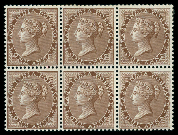 5813 nh/ogbl 22 image1865, Queen Victoria "Crown Colony" Issue, 1a deep brown (Scott 22), block of 6, o.g., lightly hinged (3 stamps never hinged), Fine to Very Fine.