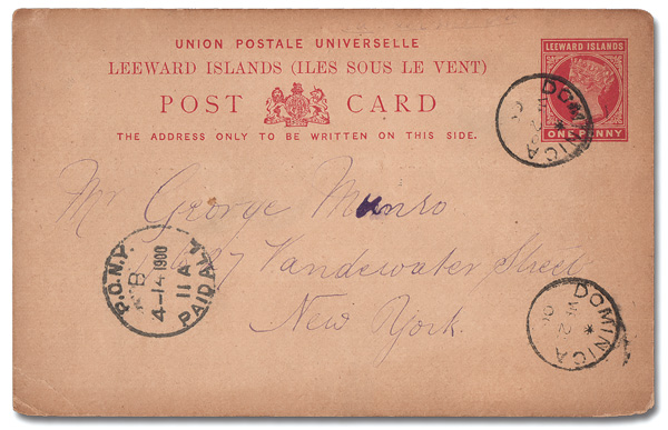 5822 cover   image1900, Queen Victoria, 1d Postal Card, used from Roseau, Dominica to New York City with small, faint manuscript "Via Bermuda"; two Dominica c.d.s.s, Mar 29, 1900, with an Apr 14 "P.O.N.Y./PAID ALL" receiver, and an Apr 10 Hamilton, Bermuda c.d.s. on the reverse; minor corner dings, Fine to Very Fine. (Image) (Image2) (All Images)