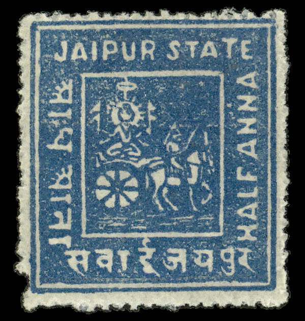 5818 og 1 image1904, ½a ultramarine, Chariot of Surya and Sun God (Scott 1), single, o.g., lightly hinged; pulled perforation bottom right corner, Fine to Very Fine.