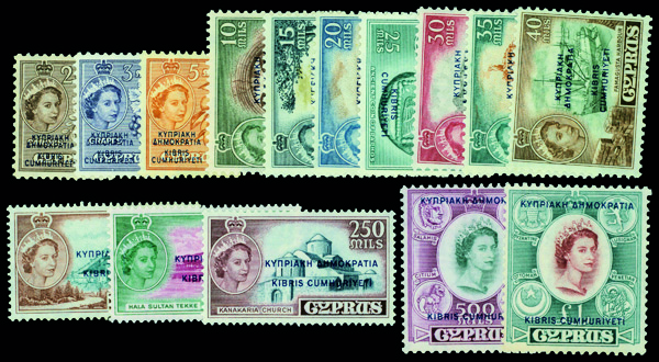 5804 og 183-197 image1960, Republic overprints on Queen Elizabeth II Pictorials, 2m to £1 complete (Scott 183-197), set of 15, complete set of singles, o.g., lightly hinged, Fine to Very Fine.