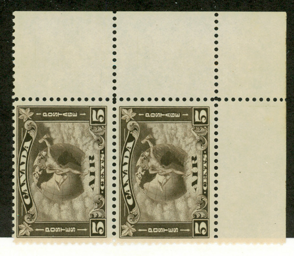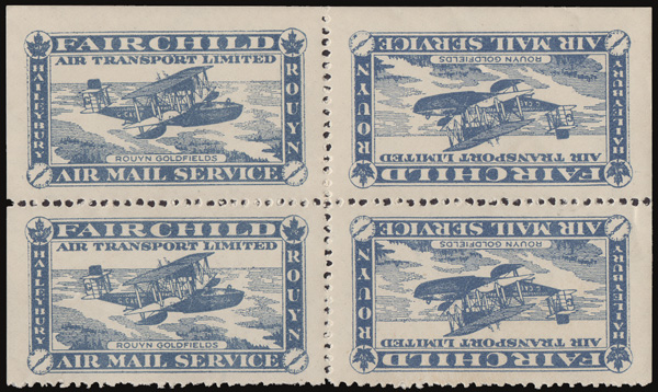 5985 nhbl CL12a imageAirmail Semi-Official, 1926 (25¢) Fairchild Air Transport Ltd., tête-bêche (Scott CL12a), block of two pairs, inverted stamp on the right, o.g., never hinged, Very Fine.