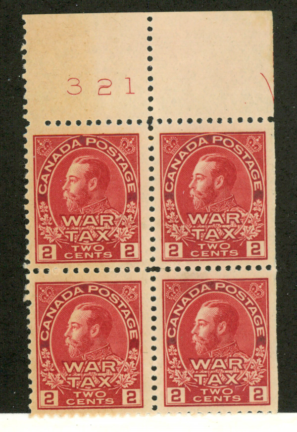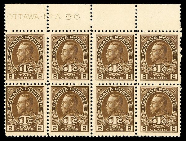 5997 nhbl MR4i imageWar Tax, 1916, King George V "Admiral", 2¢+1¢ brown, type II (Unitrade MR4i), plate block of 8, o.g., never hinged, Fine to Very Fine.