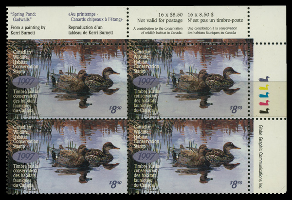 5991 nhbl FWH13 image1997, Canadian Wildlife Habitat Conservation stamp, plate block of 4, o.g., never hinged, Fine to Very Fine.