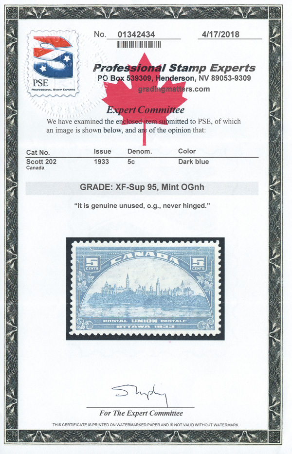5970 nh 202 image1933, 5¢ U.P.U. Meeting (Scott 202), an exceptional mint single, o.g., never hinged, post office fresh with beautifully balanced margins, Extremely Fine to Superb, with a 2018 P.S.E. certificate graded XF-SUP 95.