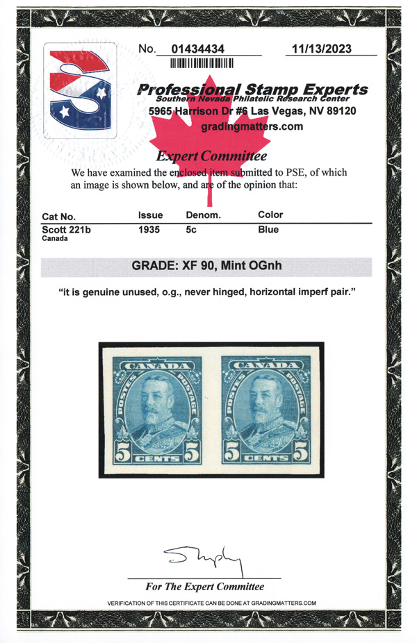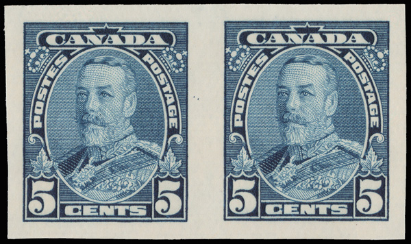 5975 nh 221b image1935, King George V, 5¢ blue, imperf (Scott 221b), an gorgeous horizontal pair, o.g., never hinged, post office fresh with large balanced margins, Very Fine. Only 150 pairs were available., with 2023 P.S.E. certificate graded VF 80.