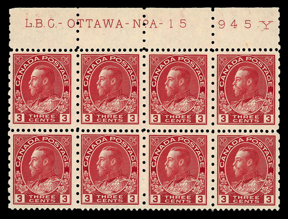 5963 nhbl 184 image1931, King George V "Admiral", 3¢ carmine, perf. 12 x 8 (Scott 184), plate block of 8, o.g., never hinged, Very Fine.