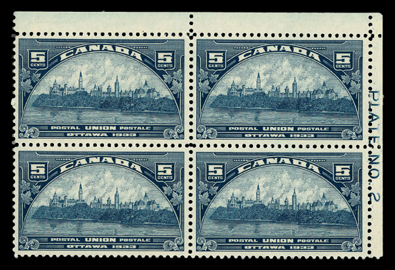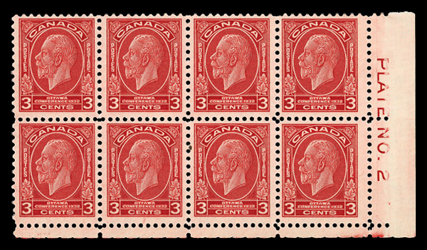 5965 nhbl 192 image1932, 3¢ Ottawa Conference, broken 'E' in 'POSTAGE', plate block of 8, o.g., never hinged, Fine to Very Fine.
