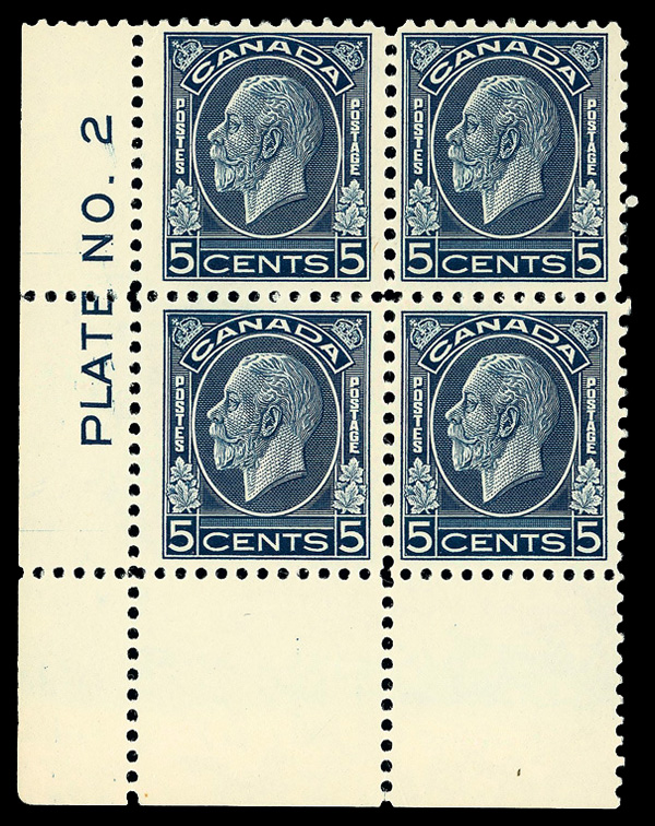 5968 nhbl 199 image1932, King George V "Medallion", 5¢ dark blue (Scott 199), plate block of 4, o.g., never hinged, Fine to Very Fine.