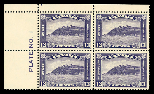 5969 nhbl 201 image1932, Quebec Citadel, 13¢ dull violet (Scott 201), plate block of 4, o.g., never hinged, Very Fine to Extremely Fine.