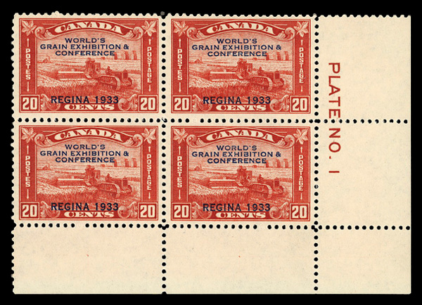 5972 nhbl 203 image1933, 20¢ Grain Exhibition (Scott 203), plate block of 4, o.g., never hinged, Very Fine to Extremely Fine.