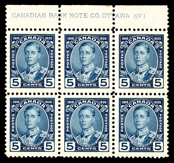 5976 nhbl 222 image1935, King George V, 8¢ deep orange (Scott 222), plate block of 6, o.g., never hinged, Extremely Fine.