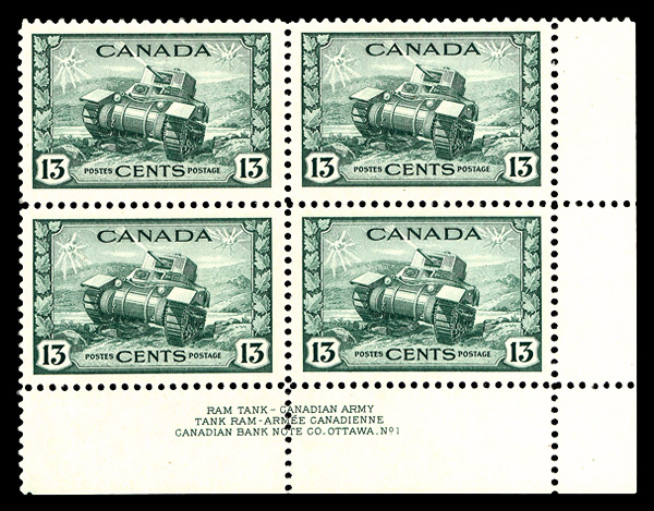 5980 nhbl 258 image1942, 13¢ Tank (Scott 258), plate block of 4, o.g., never hinged, Extremely Fine to Superb.
