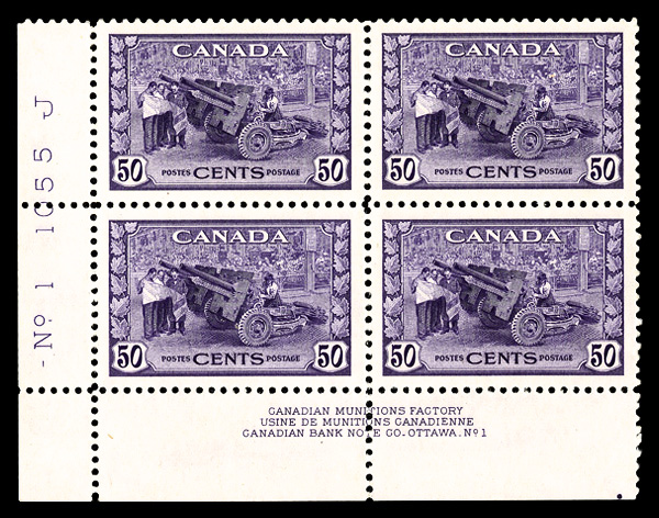 5981 ogbl 261 image1942, 50¢ Munitions (Scott 261), plate block of 4, o.g., lightly hinged, Extremely Fine to Superb.