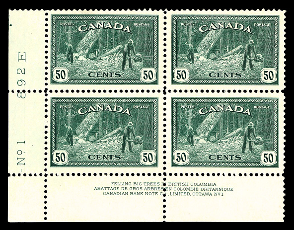 5982 nhbl 272 image1946, 50¢ Lumbering (Scott 272), plate block of 4, o.g., never hinged, Extremely Fine.