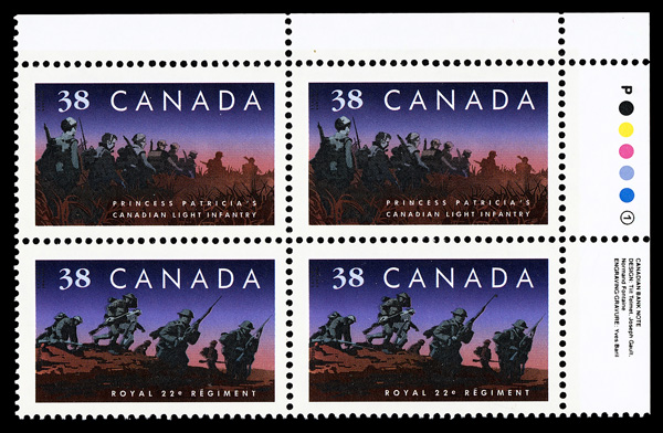 5983 nhbl 1250ii image1989, 38¢ Infantry Regiments (Unitrade 1250ii), inscription block of 4, o.g., never hinged, Extremely Fine to Superb.