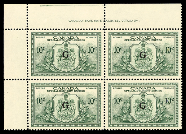 5987 nhbl EO2 imageSpecial Delivery Official, 1950, 10¢ green, "G" (Scott EO2), plate block of 4, o.g., never hinged, Extremely Fine to Superb.