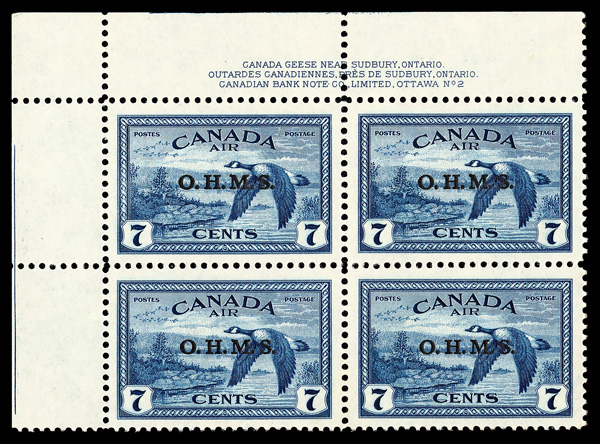 5986 nhbl CO1 imageAirmail Official, 1949, 7¢ deep blue, "O.H.M.S." (Scott CO1), plate block of 4, o.g., never hinged, Superb.