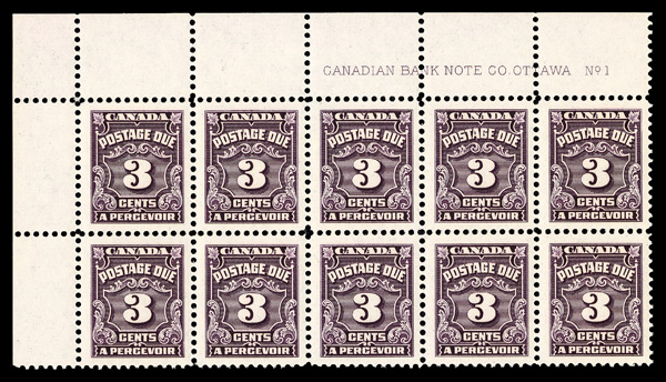 5994 nhbl J16B imagePostage Due, 1965, 3¢ dark violet (Scott J16B), plate block of 10, o.g., never hinged, Extremely Fine to Superb.