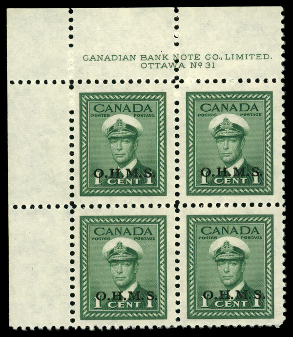 5998 nhbl O1 imageOfficial, 1949, 1¢ King George VI, "O.H.M.S." overprint (Unitrade O1), UL plate block of 4 plate #31, o.g., never hinged, Extremely Fine to Superb.