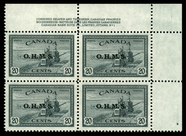 6000 nhbl O8 imageOfficial, 1949, 20¢ Combine, "O.H.M.S." overprint (Scott O8), plate block of 4, o.g., never hinged, Extremely Fine to Superb.
