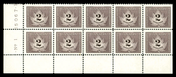 5990 nhbl FCF4a image1949, $2 brown, yellowish gum (Van Dam FCF4a), plate block of 10, o.g., never hinged, Very Fine to Extremely Fine.