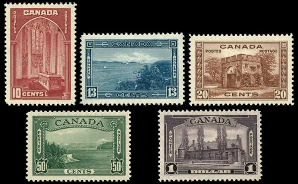 5978 nh 241-245 image1938, King George VI definitives, 10¢ to $1 complete (Scott 241-245), set of 5, o.g., never hinged (13¢ disturbed gum), Very Fine to Extremely Fine.