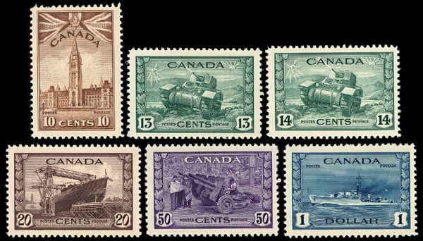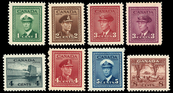 5979 nh 249-262 image1942-43, King George VI "War" definitives, 1¢ to $1 complete (Scott 249-262), set of 14, o.g., never hinged (3¢ rose violet disturbed gum), Very Fine.