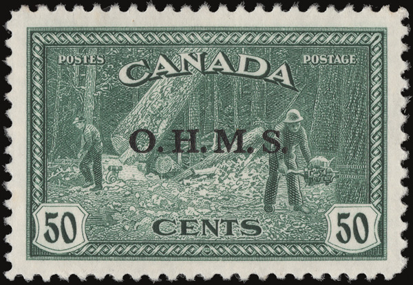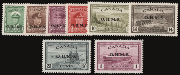5999 nh O1-O10 imageOfficials, 1949, "O.H.M.S." overprints, 1¢ to $1 complete (Scott O1-O10), set of 9, a bright, fresh set, o.g., never hinged, Very Fine.