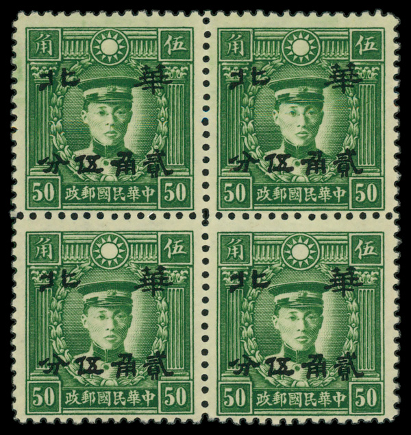 6031 nhbl 8N42 image1942, 50c green Martyrs Issue Ch'en Ying-shih surcharge (Scott 8N42), block of 4, o.g., never hinged, Fine to Very Fine.