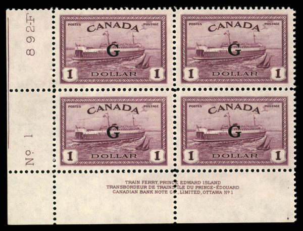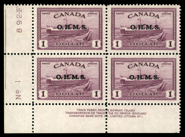 6001 nhbl O10 imageOfficial, 1949, $1 Ferry, "O.H.M.S." overprint (Scott O10), plate block of 4, o.g., never hinged, Superb.