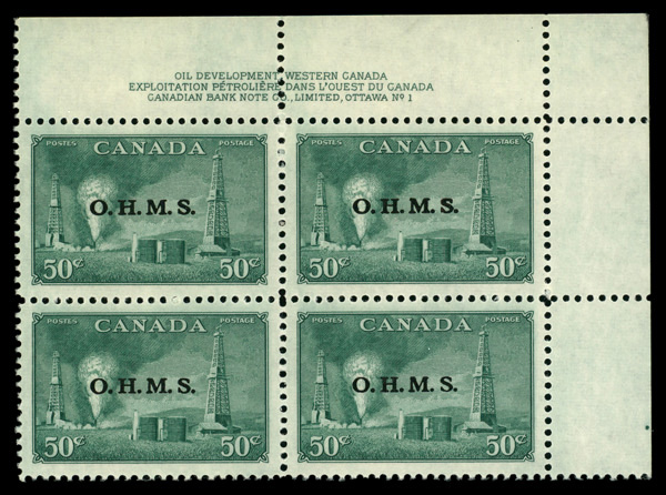 6002 nhbl O11 imageOfficial, 1950, 50¢ Oil Wells, "O.H.M.S." overprint (Scott O11), plate block of 4, o.g., never hinged, Superb.