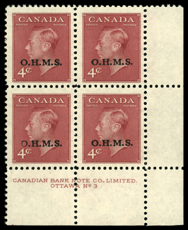 6003 ogbl O15 imageOfficial, 1950, 4¢ King George VI, "O.H.M.S." overprint (Unitrade O15), LR plate block of 4 plate #3, slightly disturbed o.g., Very Fine.