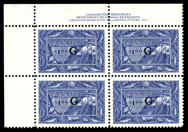6005 nhbl O27 imageOfficial, 1951, $1 Fishing Resources, "G" overprint (Scott O27), plate block of 4, o.g., never hinged, Extremely Fine to Superb.
