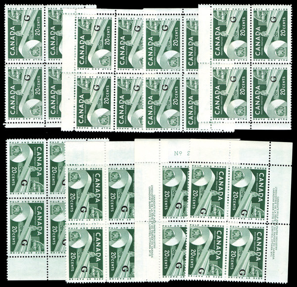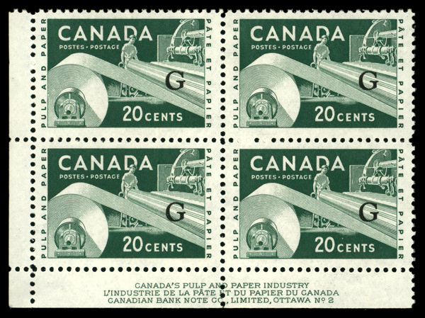 6008 nhbl O45a imageOfficial, 1962, 20¢ Paper Industry, "G" overprint, thin "G" (Unitrade O45a), LL plate block of 4 plate #2 narrow margin, o.g., never hinged, Extremely Fine.