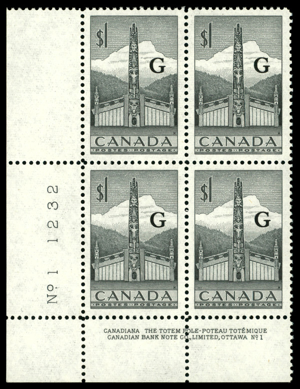 6006 nhbl O32 imageOfficial, 1953, $1 Totem Pole, "G" overprint (Scott O32), plate block of 4, o.g., never hinged, Extremely Fine to Superb.