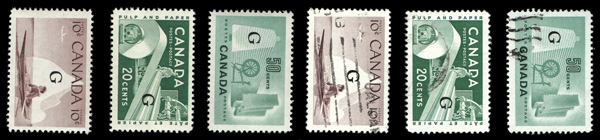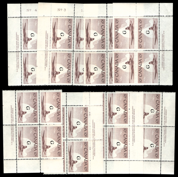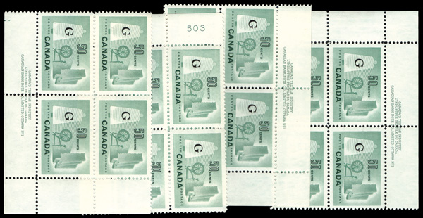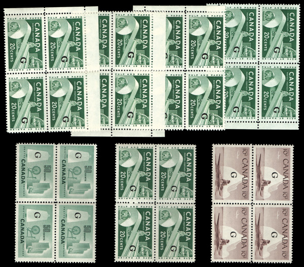 6007 nh O38a, O39a,O45a imageOfficial, 1961-62, 10¢, 20¢ & 50¢ "G" overprint type C (Scott O38a, O39a,O45a), small group of plate block matched sets comprising 50¢ O3aa, plate 1; 10¢ O39a plates 3 & 4; and 20¢ O45, blank corners; also includes a plain block & single of each, plus the 20¢ O45 (type B overprint) matched sets of plates 1, 2, 2 narrow and blank corners, the last unlisted, o.g., never hinged, Very Fine.