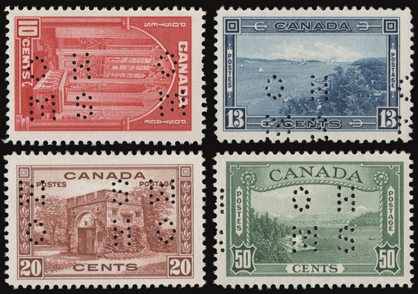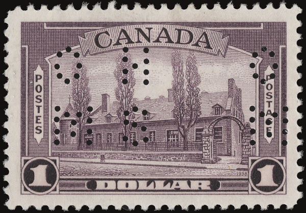 6009 nh O241-O245 imageOfficials, 1938 Definitives, 4-hole "O.H.M.S." perfins, 10¢ to $1 complete (Scott O241-O245), a choice mint set, the $1 is the aniline violet variety, o.g., never hinged, Very Fine to Extremely Fine.