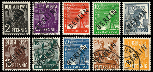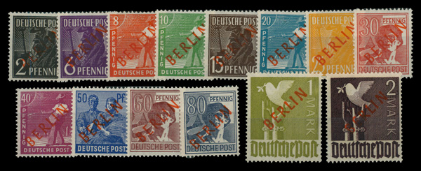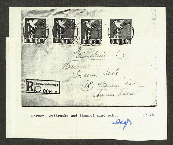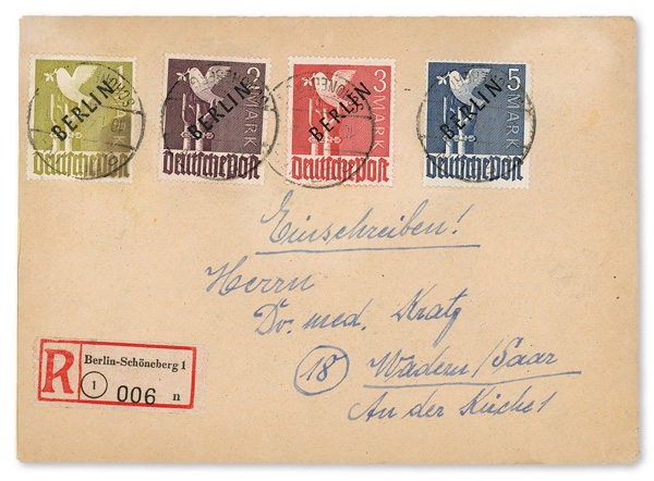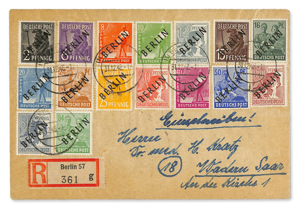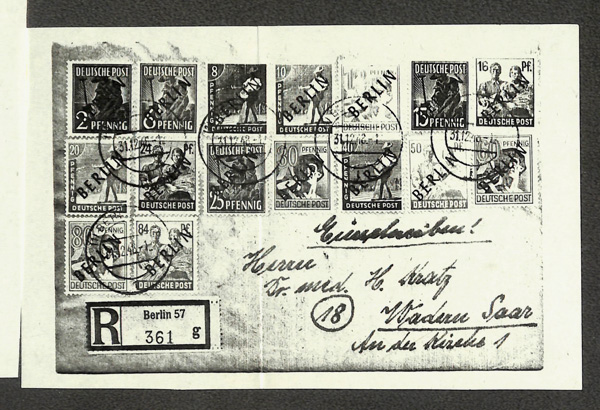 6147 cover 9N1-9N20 image1948 Black Overprints complete (Scott 9N1-9N20), on two Registered covers to Wadern, Saar, the pfennig values on one, the Mark values on the other, all tied by Berlin bridge cancels; 1M stained at lower right, others fresh and clean, Fine to Very Fine, with partial photocopy of 1978 Schlegel certificate.